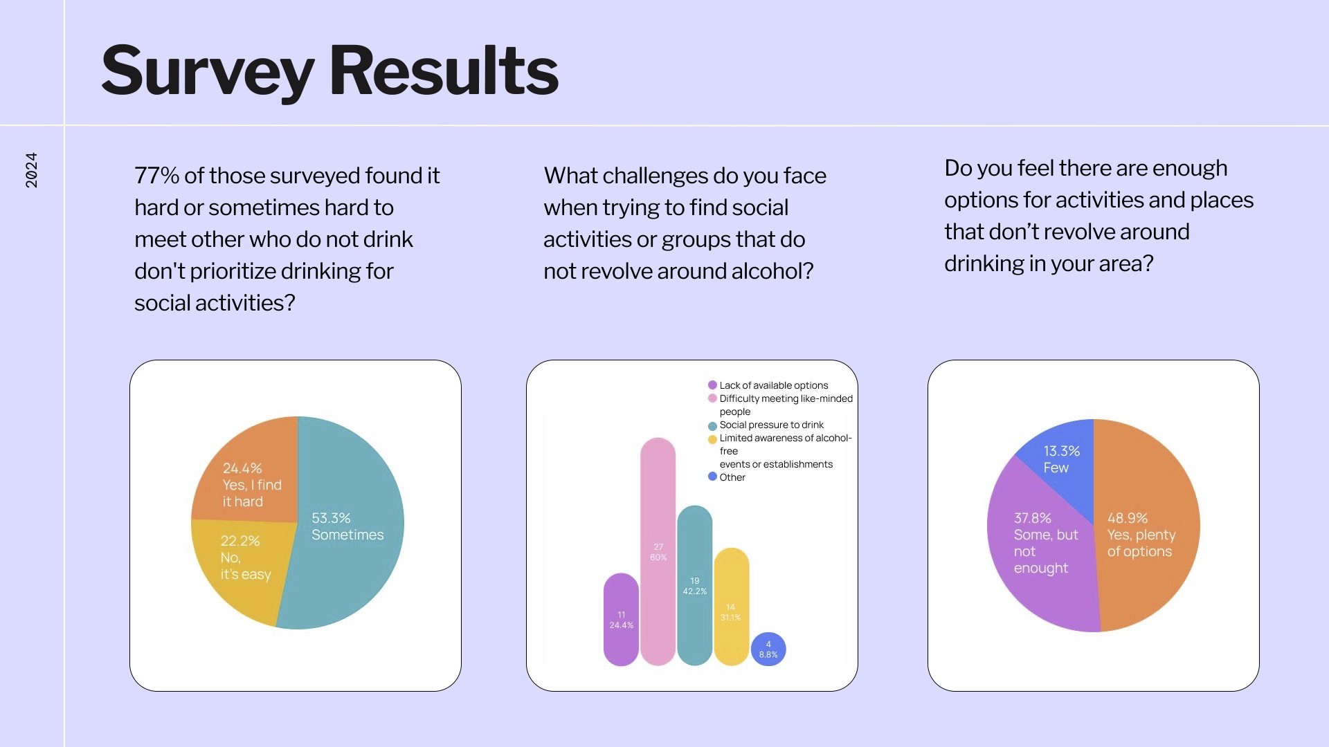 We surveyed 45 adults and interviewed one self-identified non-drinker. Key findings: 77% reported it is hard or sometimes hard to meet others who don’t prioritize drinking Many struggle to find alcohol-free events in their area Several participants reported feeling left out in social settings