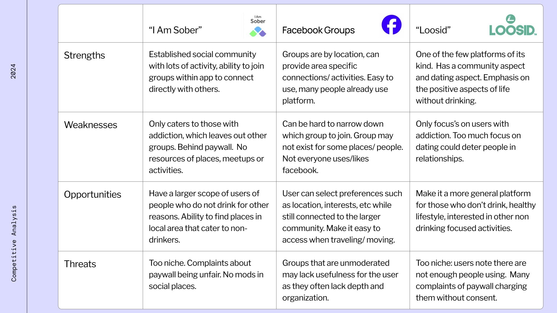 To better understand the ecosystem, I conducted a competitive analysis of platforms such as Facebook groups, I Am Sober, and Loosid. While these platforms provide community spaces, they revealed key gaps:
